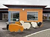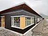Fasaden har trekledning i svart, med okergul kledning