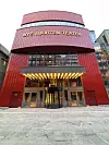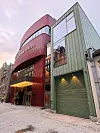 teaterets knallrøde fasade med glinsende keramiske flis.