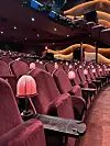 Hovedsalen har seter i røy fløyel med små lampetter og et lite bord mellom