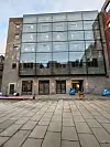 flott liten gate belagt med brostein. Foran det nye teaterbygget danner