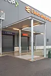 glassfasaden på plan 1 og ved parkeringsdekket i plan 2. Hele bygget har