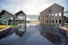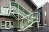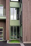 av midtbygget og i skillene mellom byggene. Hovedinngangen ligger i midtbygget.