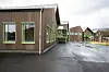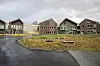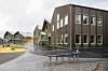 bestående av seks sammenhengende hus med saltak som omkranser en skoleplass,