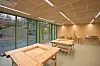 bærekonstruksjoner i aula og treullsement i himling. Treet er kombinert med en