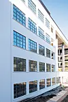i pussfasaden med prefabrikkerte elementer. Nye fasader på plan en og på de nye
