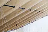 bjørkefinér med treulitt i skråtaket på toppen. Det gir god akustikk. Innvendig