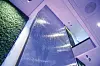 med rennende vannspeil på veggen over to etasjer, med lilla belysning.