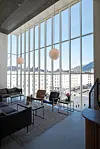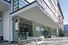 og glass. Det er glassfasader i hele plan 1 og en fem etasjer høy glassfasade