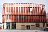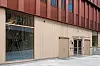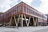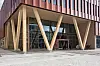 aluminium. Ved hovedinngangen er det glassfasader og skråstilte limtresøyler.