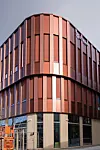 Den rustrøde aluminiumsfasaden er kåpen til bygget som