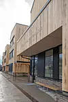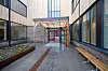 Hovedinngangen ligger midt på bygget og det ligger en allmenning innenfor