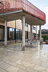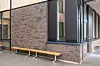 er det første som møter en, en spraglete teglvegg, her er det brukt ombrukstegl