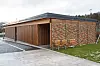 brystning i teglstein mot bakke langs hele bygget og bruk av bindingsverk med