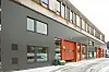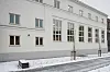platekledning av aluminium. Det gamle skolebygget har puss på fasadene. Ved