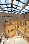 (atriet). Via fasadene i sør og øst åpnes det opp mot forplassen i sør, og mot