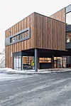 deler av fasadene og stålplatetak. Resten av bygget har Møre Royal trekledning